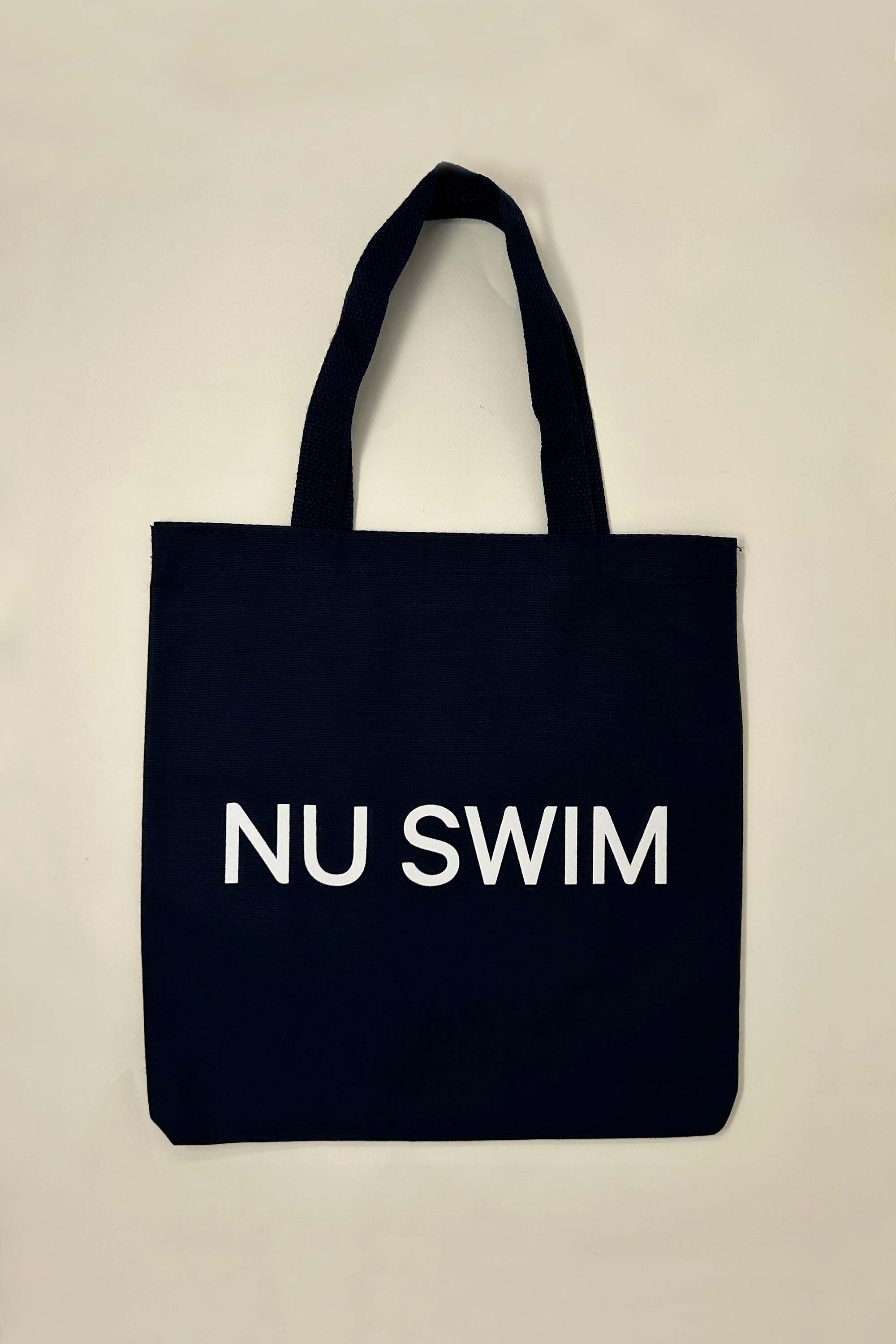Black cotton tote bag with Nu Swim screen printed in cream on one side. Made in Vermont.