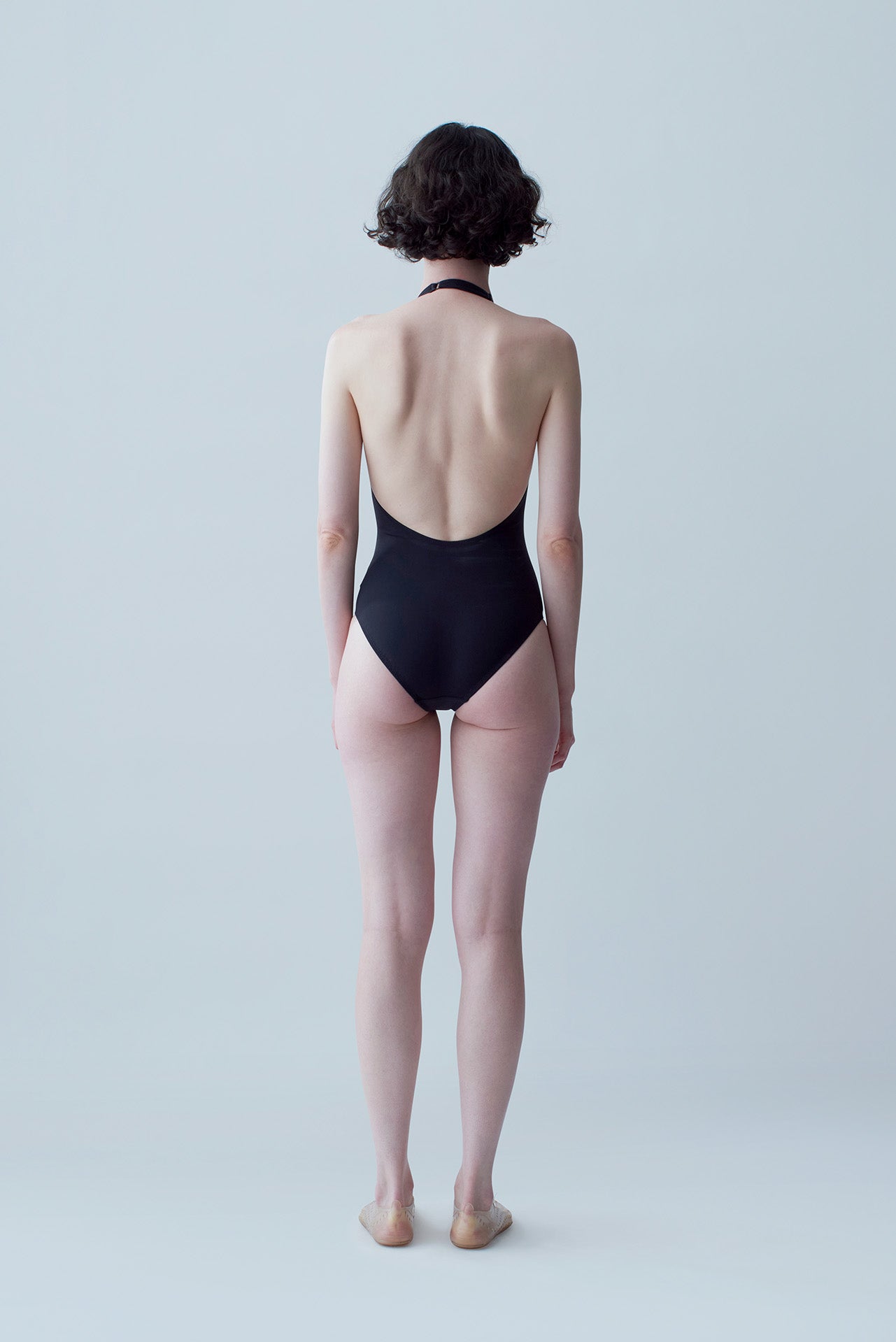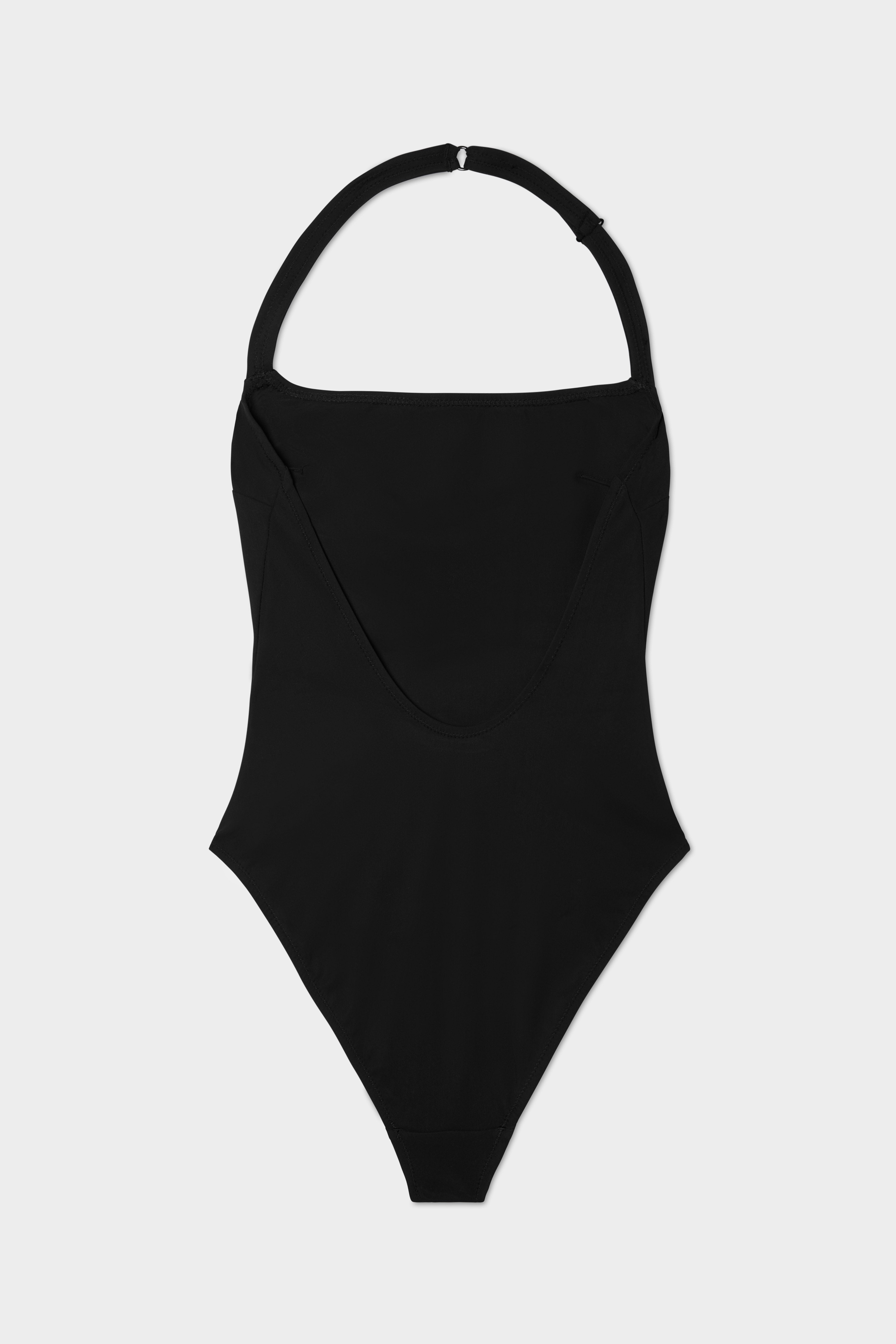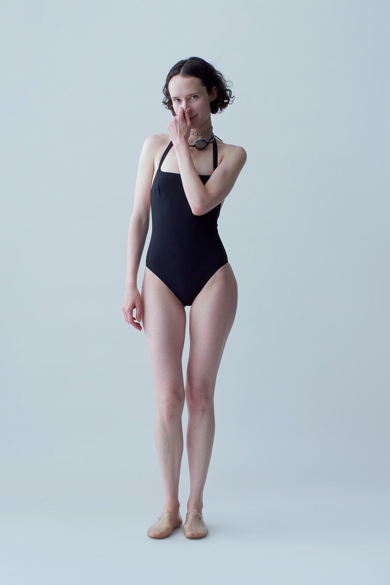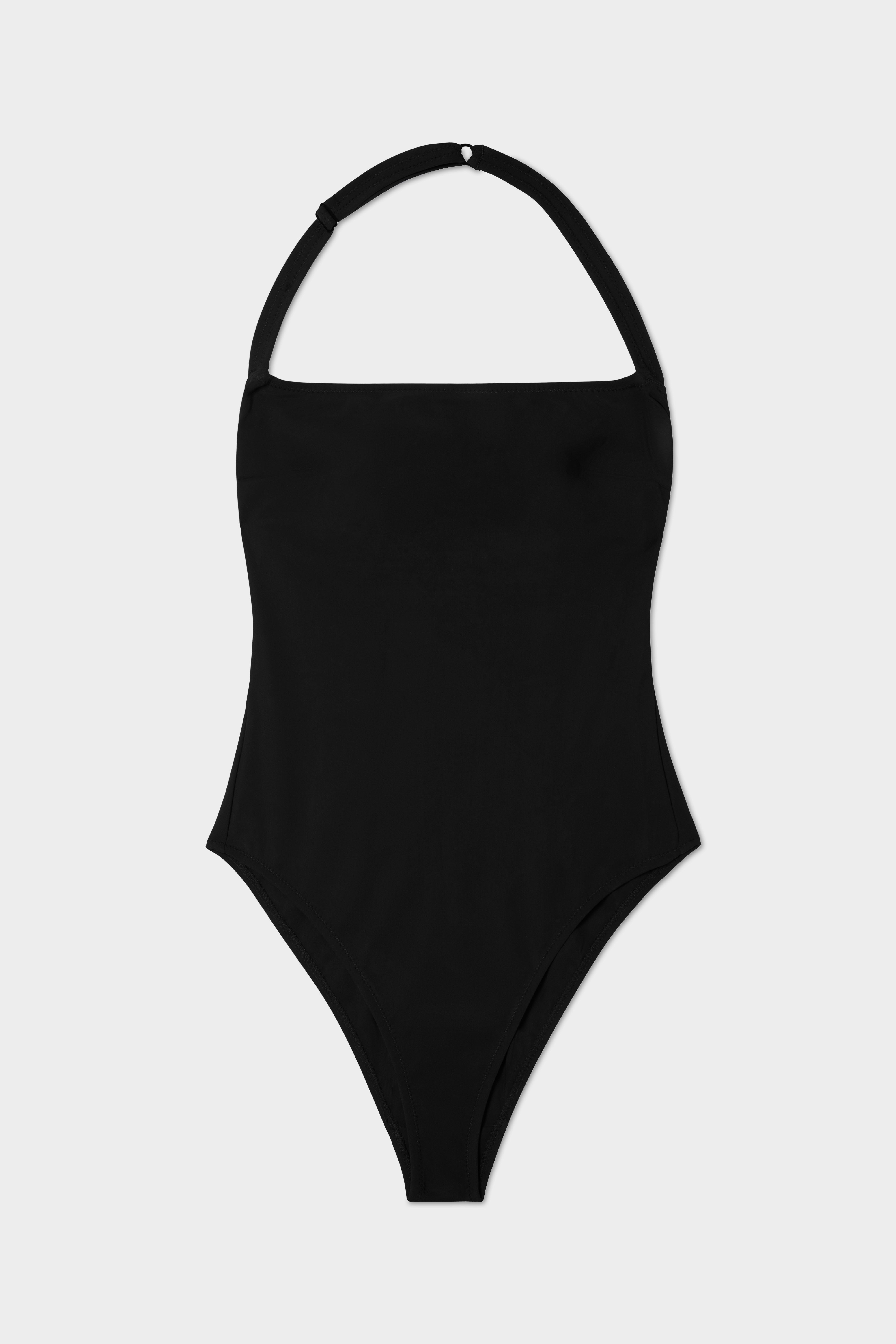 One piece squared neckline halter suit with a mid-cut leg. Constructed in our bonded jersey for ultra-comfort and versatility.