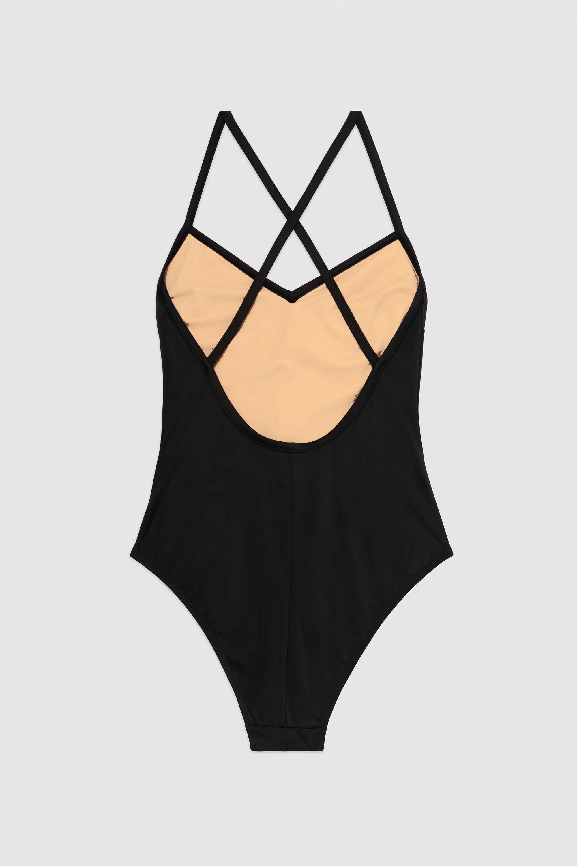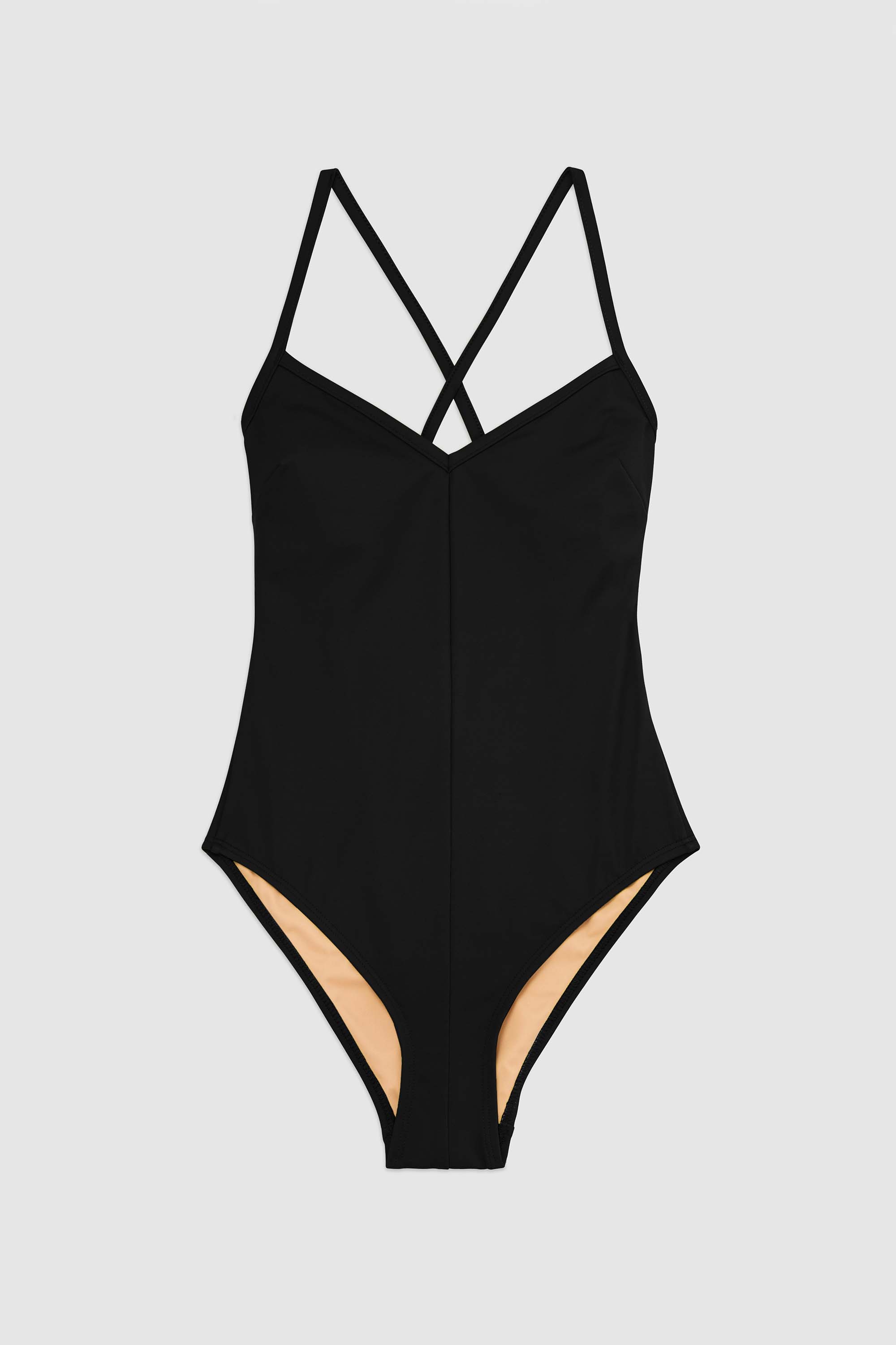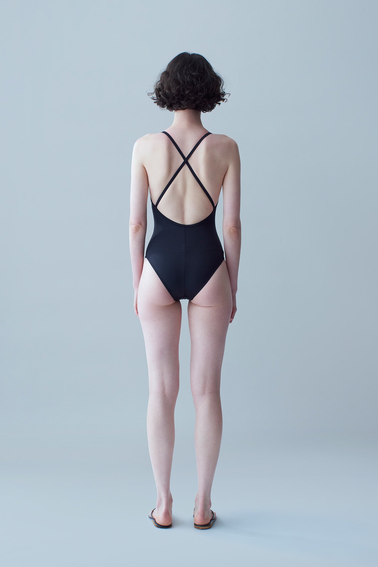 A cross-back one piece with 3/8" binding and straps and a mid-cut leg for medium coverage.