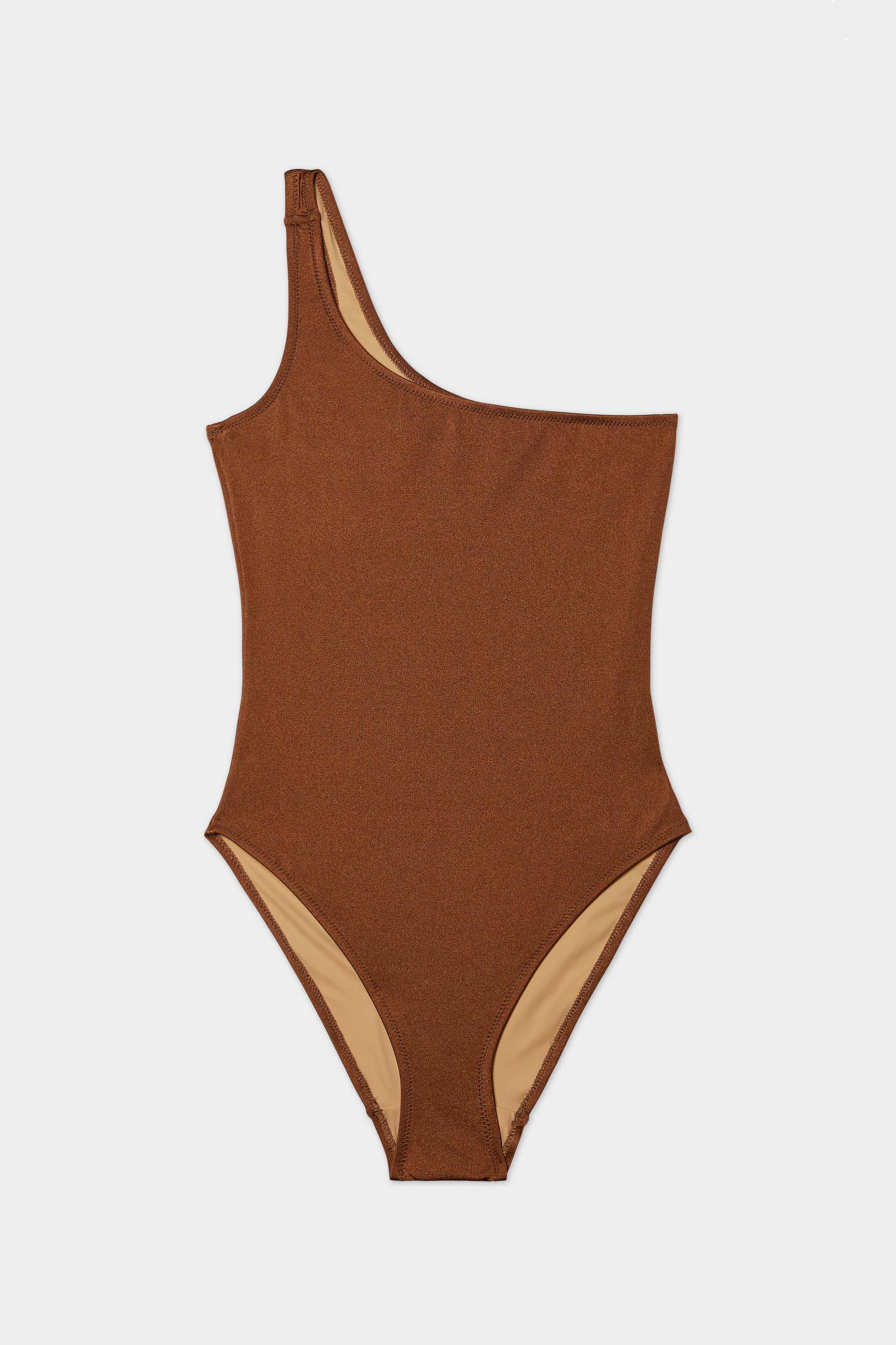 An asymmetrical one-shoulder maillot style with a mid-cut leg for medium coverage.
