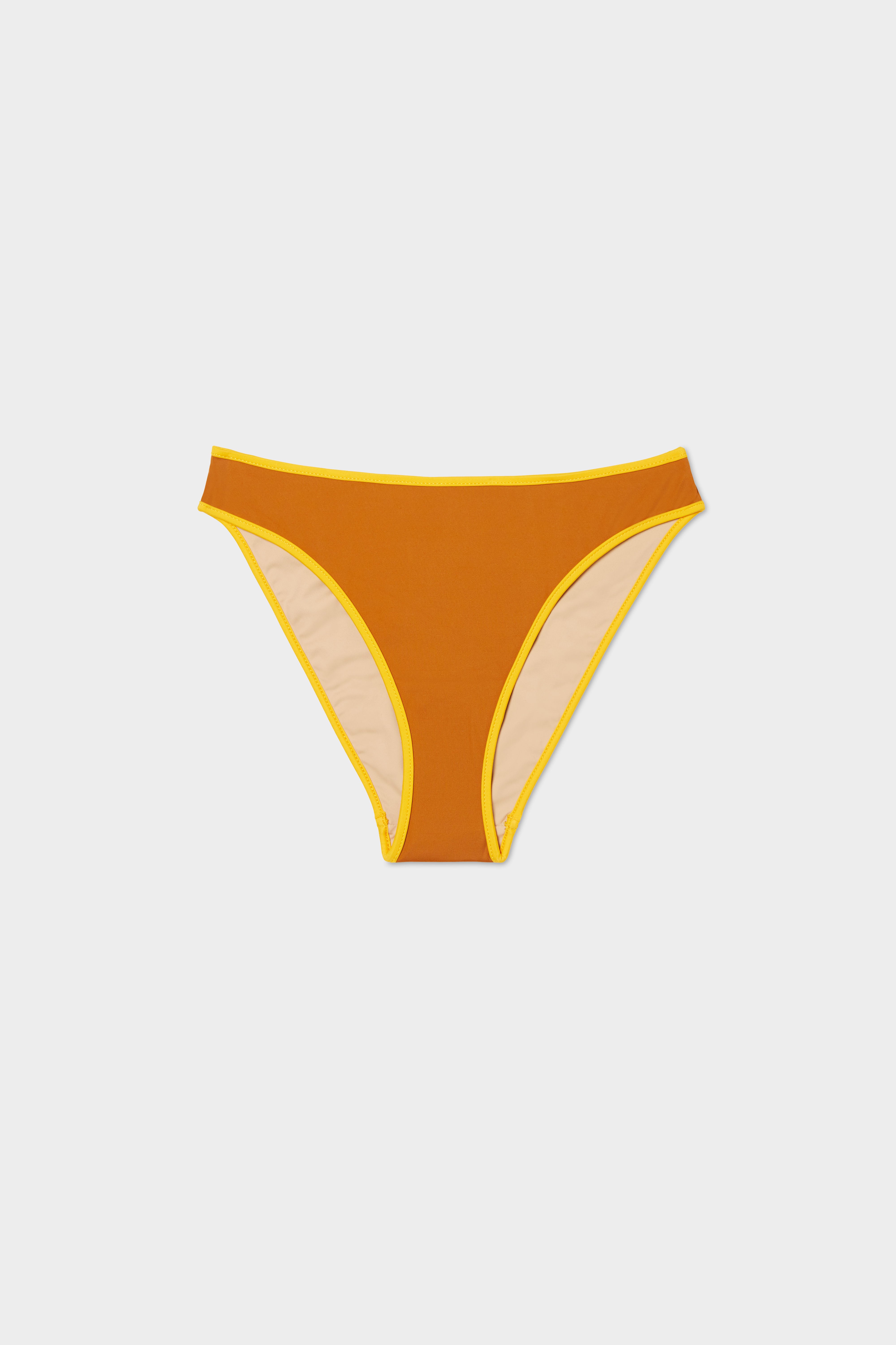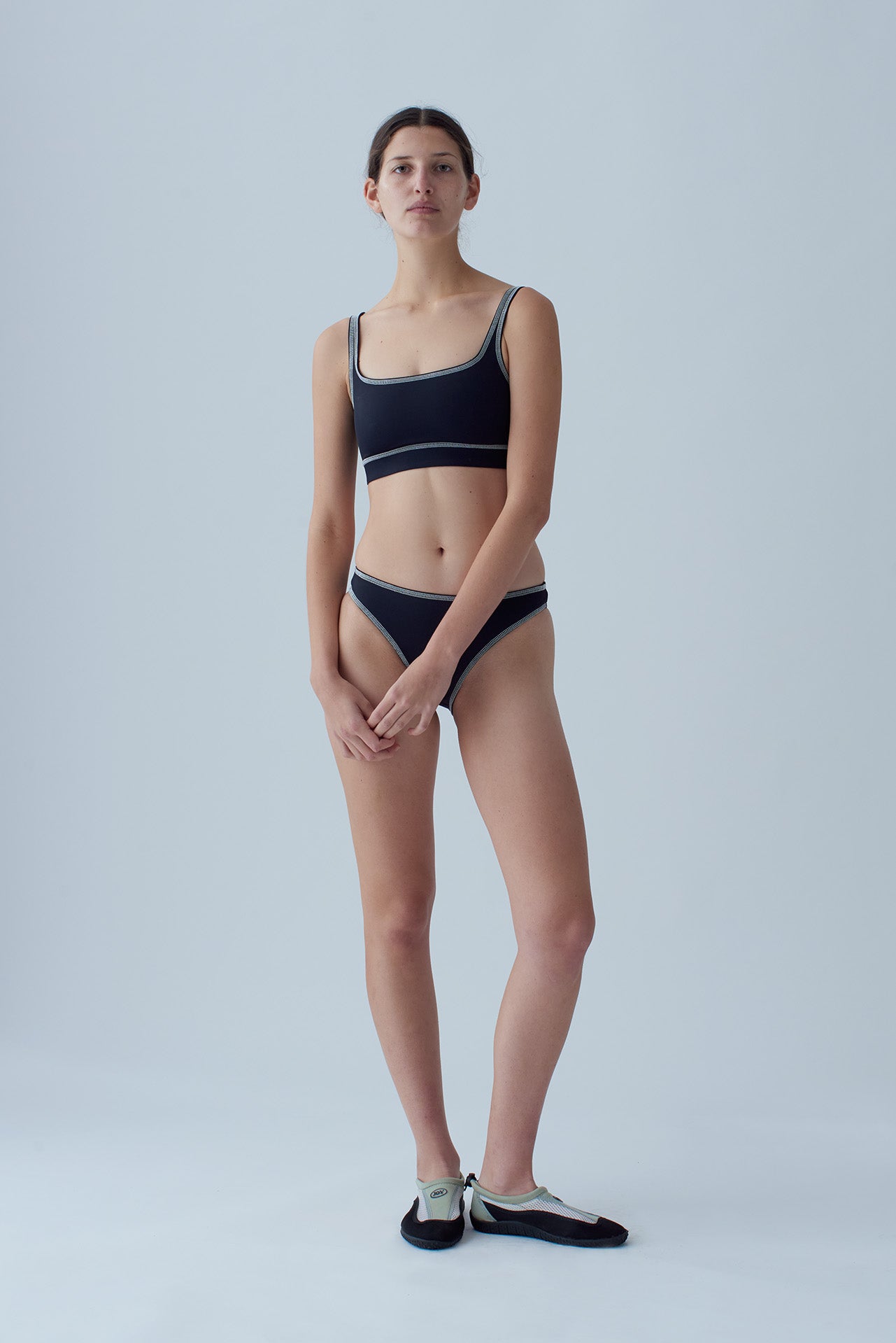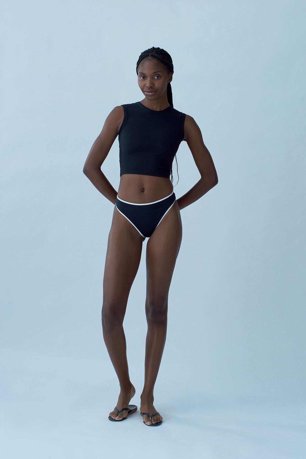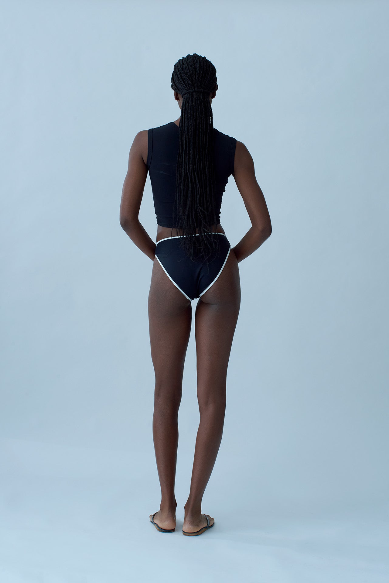 A simple bottom cut high on the hips and the back, but lower at the front. Finished with 1/4 inch contrast binding at the waist and leg openings.