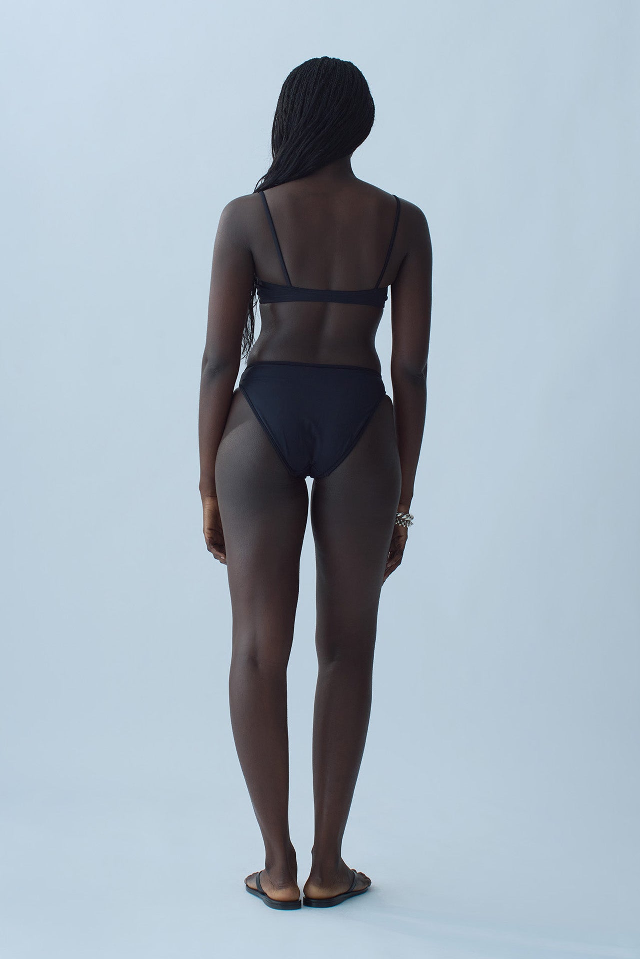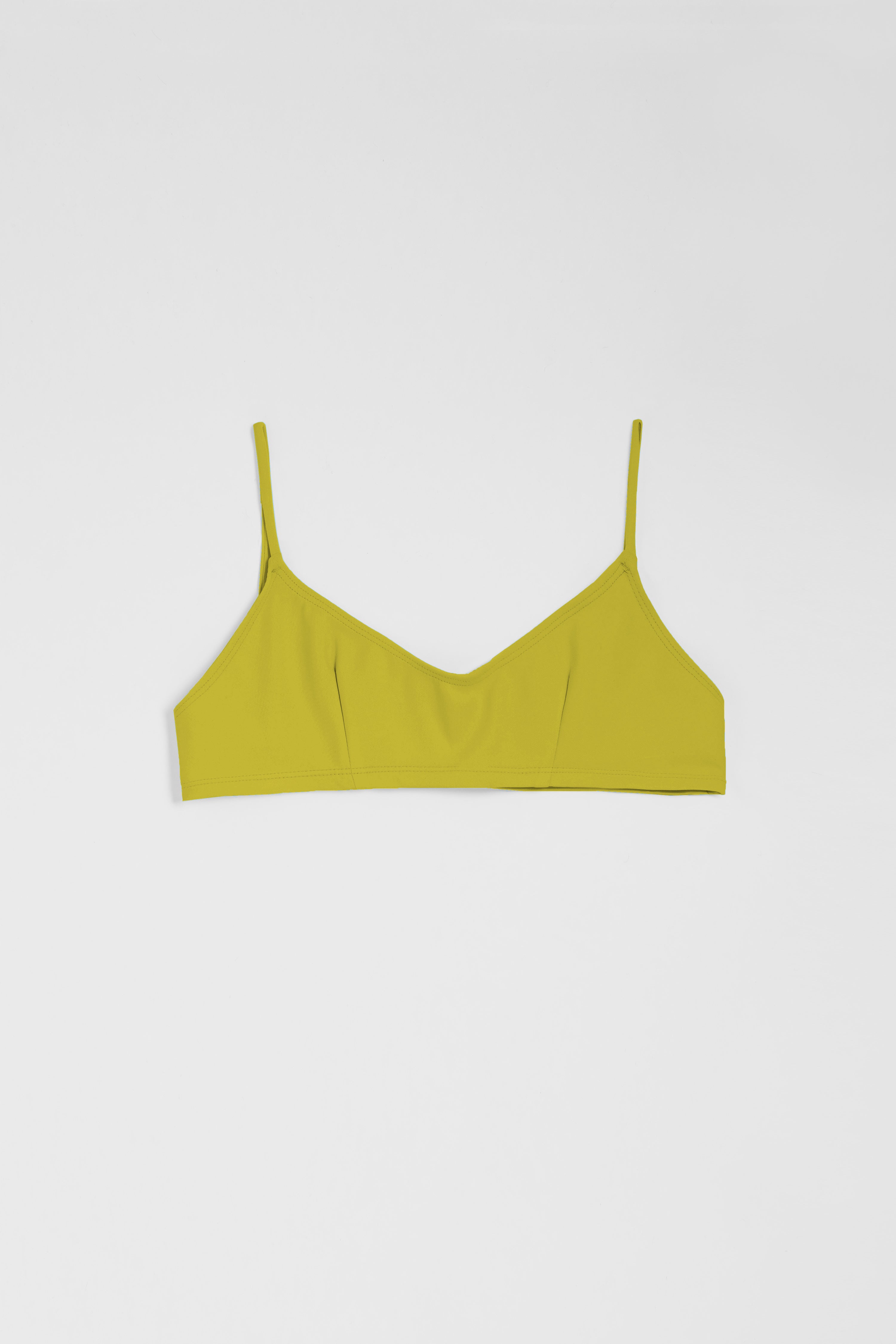 Simple bralette-style top with darts at bust for fit and 1/2" encased elastic hem for extra support. Medium coverage.