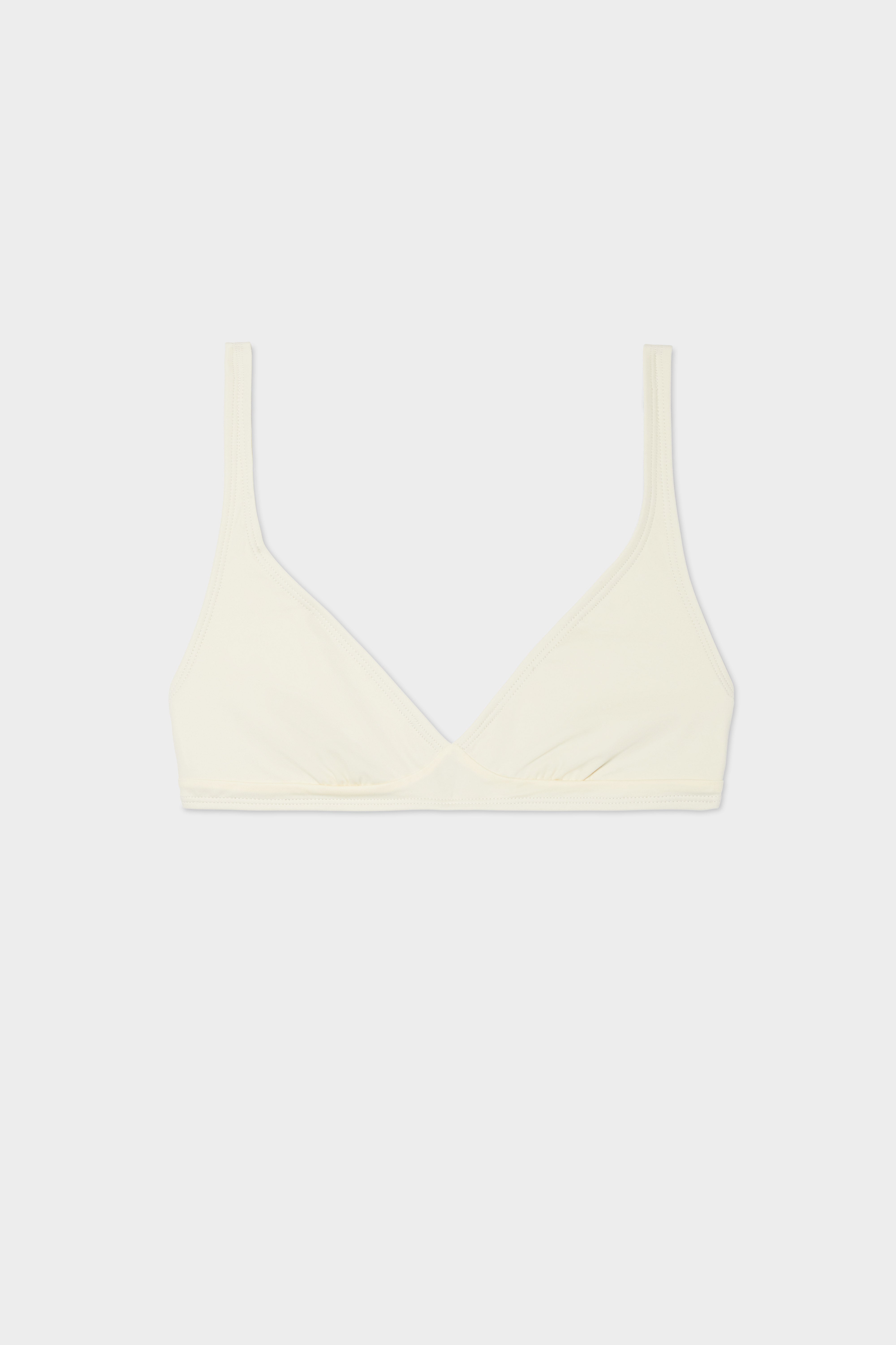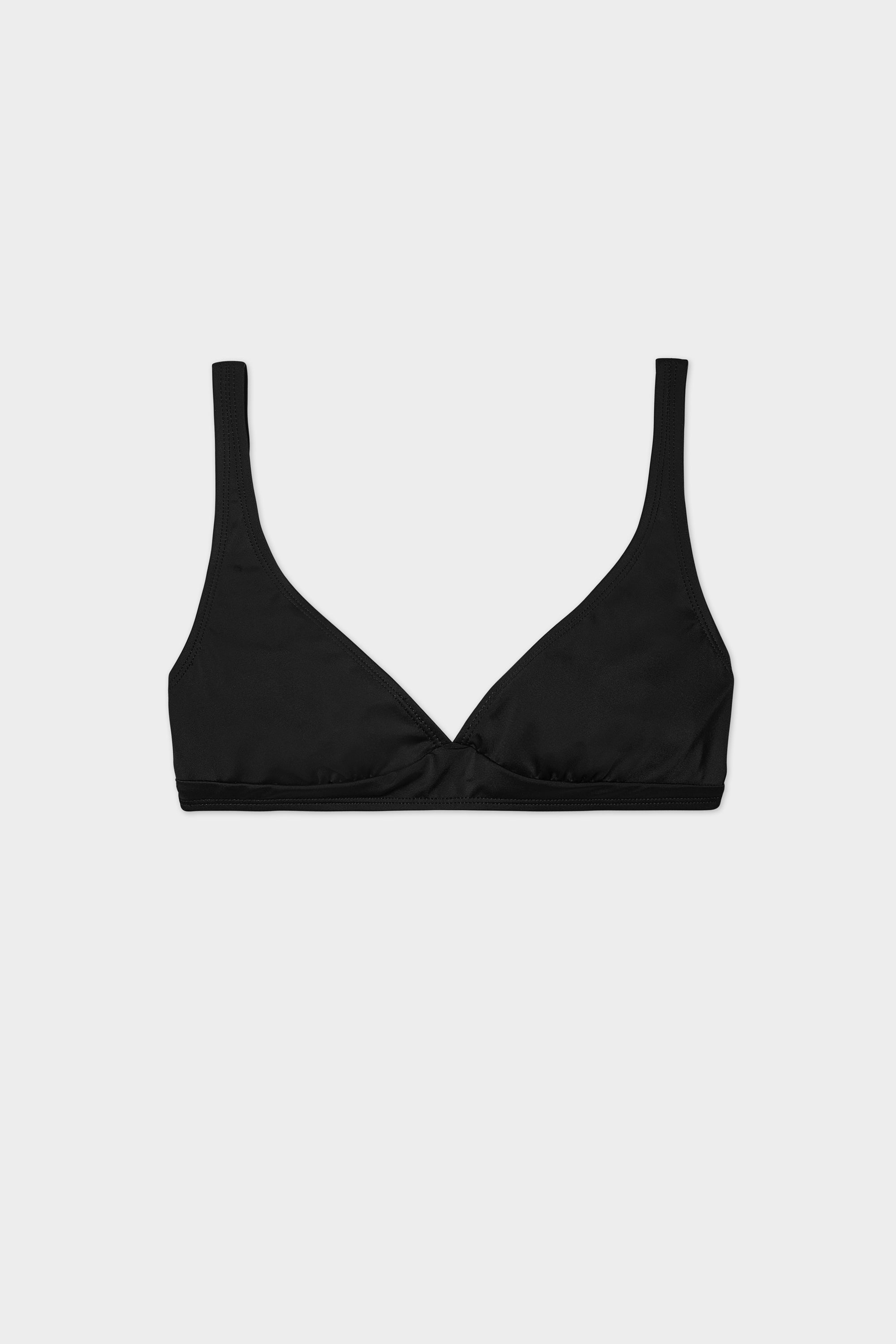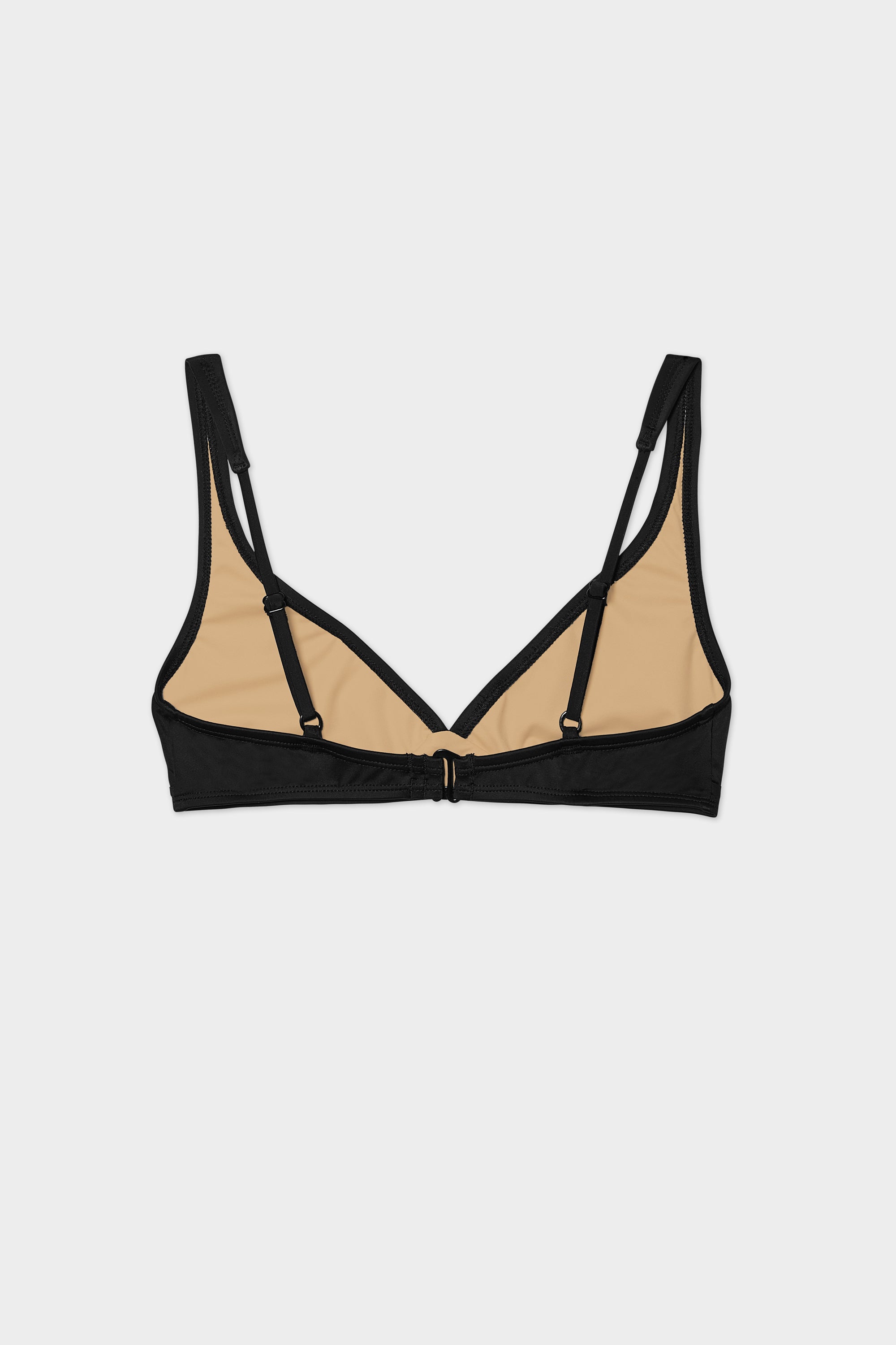 Versatile, supportive top with shirring under bust for fit, adjustable straps and back hook closure.