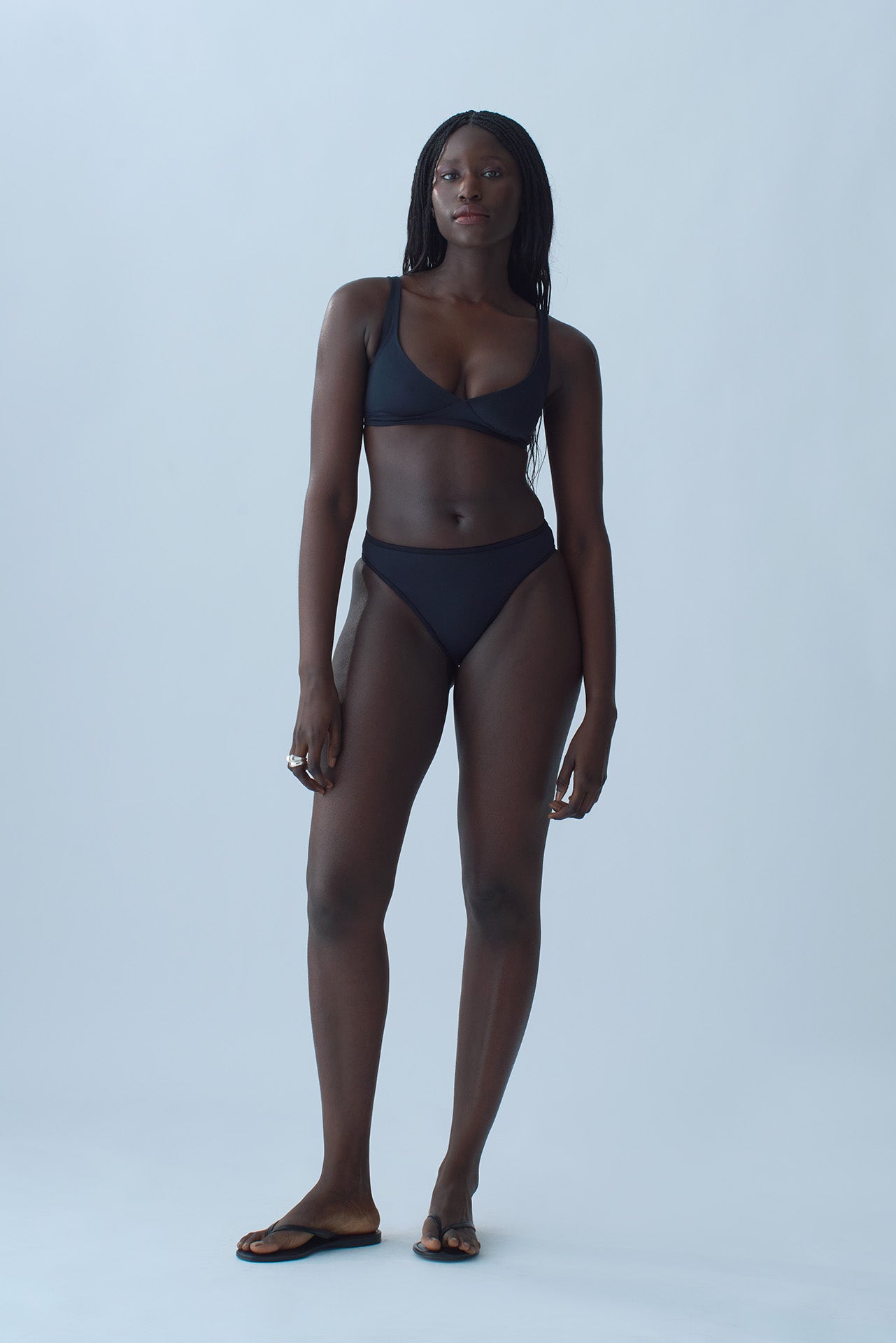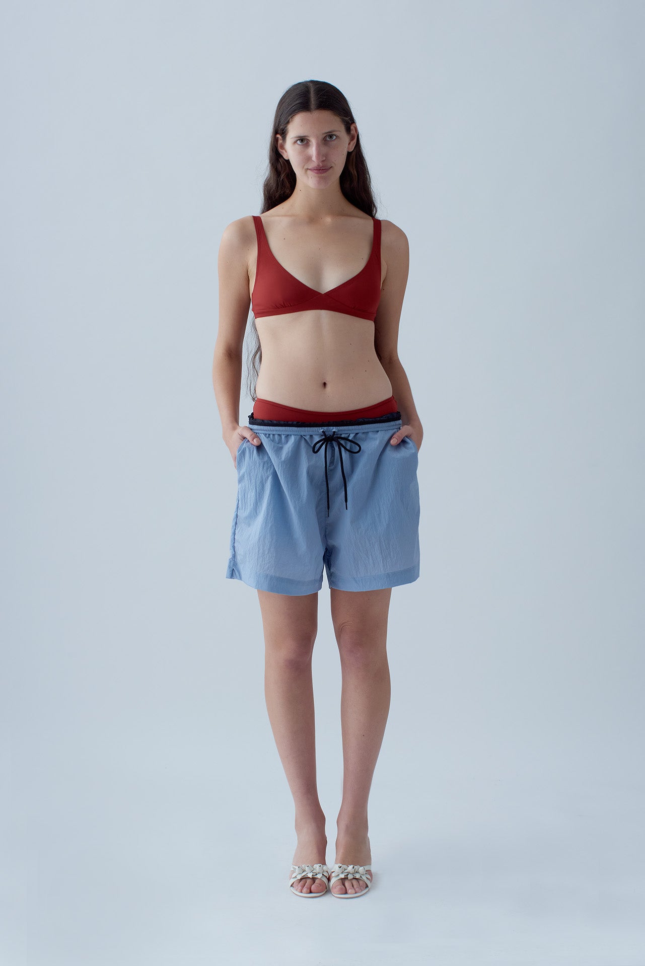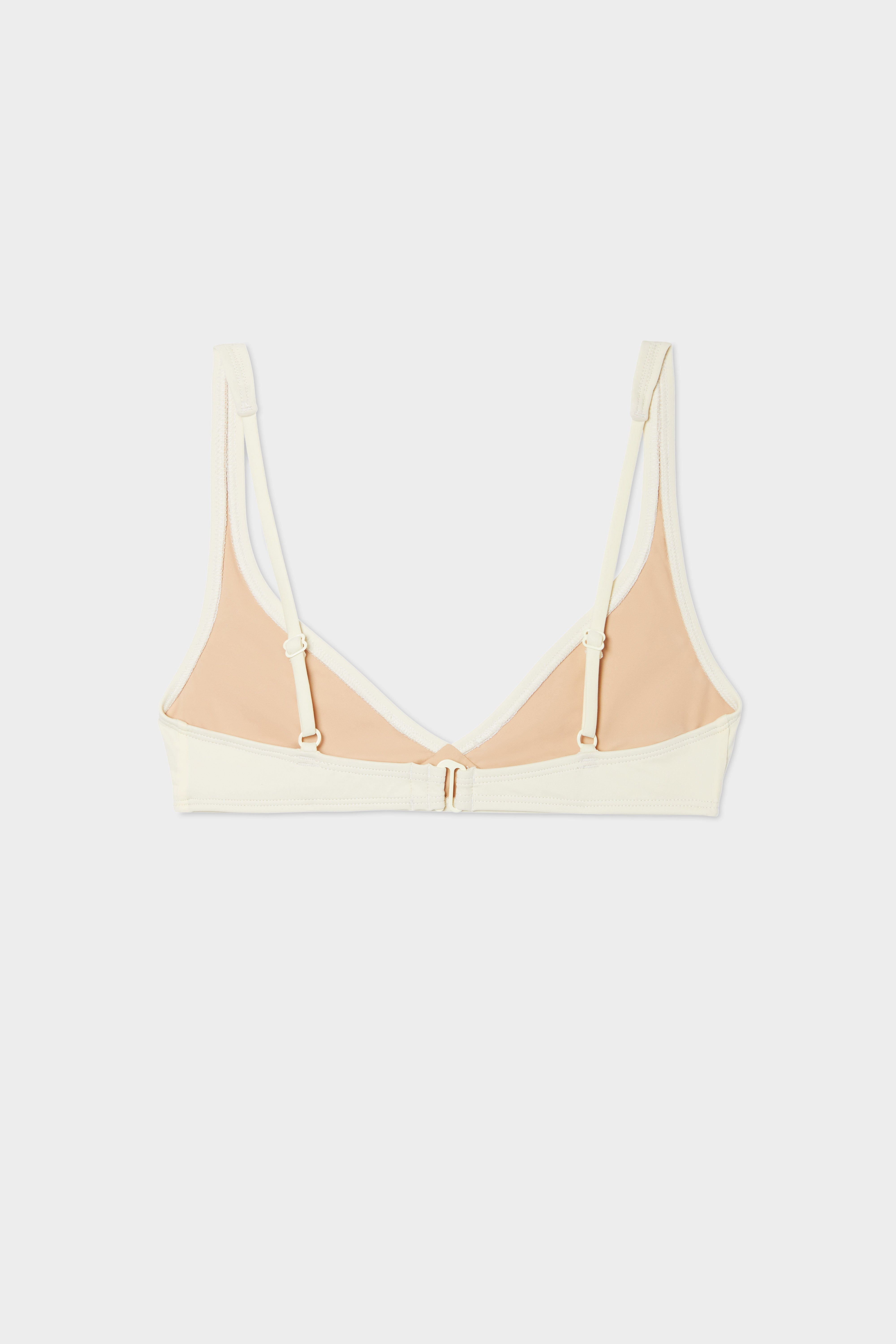 Versatile, supportive top with shirring under bust for fit, adjustable straps and back hook closure.